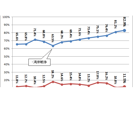 日米安全保障条約が日本の平和と安全に役立っていると思うか(経年変化)(内閣府調査)