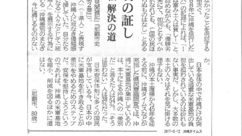 「日米安保体制に多くの国民が支持している今、日本の中に米軍基地を引き取ることが差別をやめるためのステップだ。」(那覇市の80歳の男性。2017・6・12沖縄タイムス「論壇」)