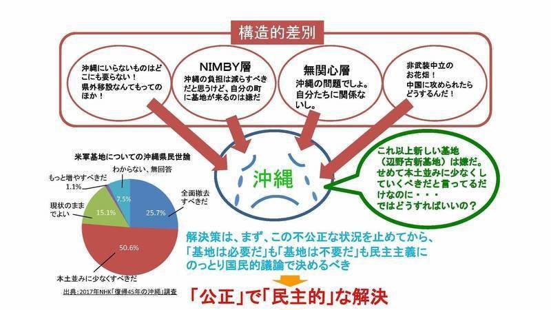 沖縄が今求めているものは、まずこの不公正な状況を止めてから、安全保障の問題は、沖縄の問題ではなく、日本全体の問題であり、「基地は必要だ」も「基地は不要だ」も、沖縄で議論するのではなく、民主主義に則り、国民的議論で決めるべきというものです。