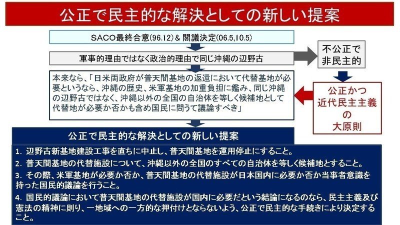 軍事的理由ではなく政治的な理由で辺野古に決定したSACO合意&閣議決定は非民主的で不公正。日米両政府が普天間基地の返還において代替基地が必要というなら、沖縄の歴史、米軍基地の加重負担に鑑み、沖縄以外の全国の自治体を等しく候補地として代替地が必要か否かも含め国民に問うて議論すべきです。この当たり前のことを全国の自治体に地方自治法99条に基づく意見書の採択を求め、多数の可決がされれば、「辺野古が唯一」は瓦解します。