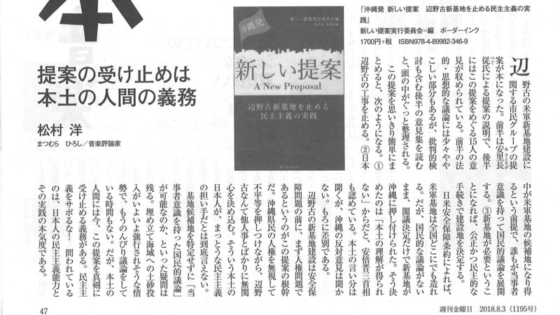 Petition update辺野古新基地建設を止める新しい提案 A New Proposal to Stop the New US Military Base Construction in Henoko,週刊金曜日に書評が掲載されました。「提案の受け止めは本土の人間の義務」