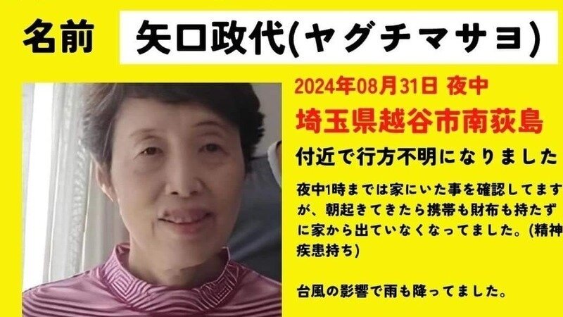 知り合いのお母さんが8月31日の夜中から現在も行方不明との事です