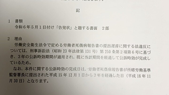 労働安全衛生法令で定める労働者死傷病報告書の提出遅延に関する法違反については、刑事訴訟法(昭和23年法律第131号)第250条第2項第6号に基づき、3年の公訴時効期間が適用され、既に当該期間を経過して公訴時効が完成しているため。