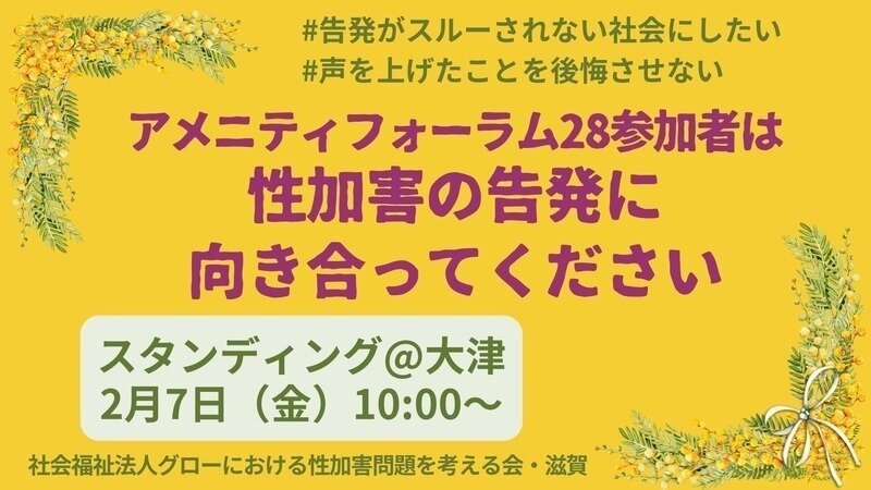 北岡氏の性加害問題の裁判は、北岡氏の控訴により木村さん(仮名)にかかる控訴審が2月21日から始まること、グローの人事刷新などはまだ行われていないこと、県のグローに対する指導の問題、そして何よりもこの問題の検証がなされていないこと等々をはじめ他にも問題・課題は残されたままです。今後当会としては、たちまち県の回答に対する当会のコメントの公表なども行いながら、さらに、多くの皆さんに訴えていきたいと思います。