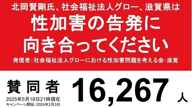 私たち、社会福祉法人グローにおける性加害問題を考える会・滋賀(以下、当会)では、北岡賢剛氏、社会福祉法人グロー、滋賀県に性加害の告発に向き合うことを求めて2024年2月から署名を募ってきました。2024年10月24日の判決後、11月1日に貴法人へ署名15,990筆を提出すると共に要望を致しました。貴法人からは、11月8日に要望への回答をいただき、同日、貴法人は控訴しない方針を公表されました。それらを踏まえた当会の声明を11月22日に発出し、貴法人へもお送りしました。その後、滋賀県への署名の提出と申し入れは行いましたが、貴法人への直接の申し入れ等は行って来ませんでした。