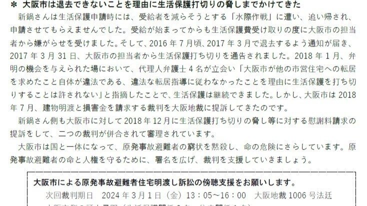 Обновление к петиции原発事故避難者を大阪市営住宅から追い出さず命と人権を守るために公正な判決を求めます。3月1日は大阪市証人尋問の期日です!署名は5月末まで!更にご協力をお願いします!