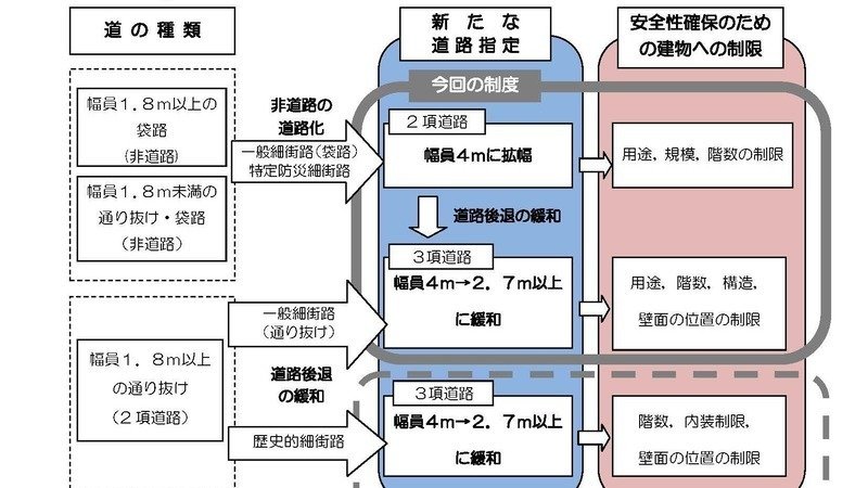 三項道路にすることにより、沿道の住宅のセットバックが少なくて済むうえ、外来からの4輪車の流入による交通危険性も回避できます。この場合、そもそも4m道路への開削そのものが不要になるため、今回の開削計画は根本的に見直すのが妥当という要望です。