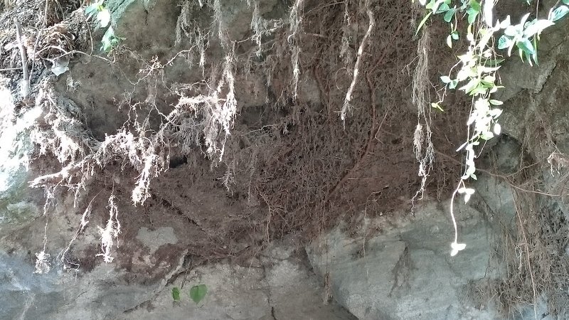 写真を撮って確認すると、木のひげ根が剥落面上部をビッシリと覆っています。盛夏のため、木の根の拡がりにつれて岩が広範囲に剥落したものと思われます。