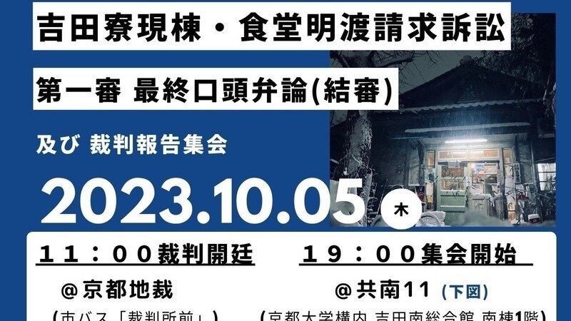 10月5日(木)11時より、吉田寮現棟・食堂明渡請求訴訟の第一審・最終口頭弁論(結審)が京都地方裁判所にて行われます。