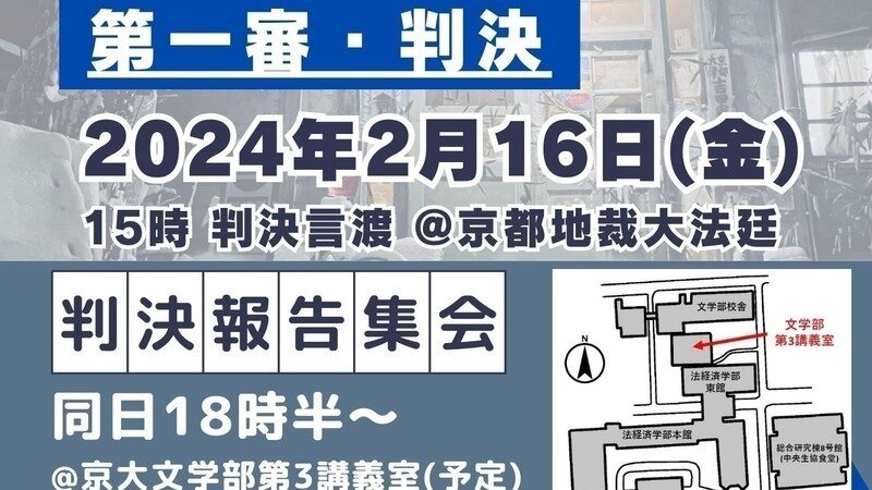 判決後、18時30分から京大の講義室にて対面・オンライン(zoom)双方のハイブリッド形式での報告集会を開催します。お誘い合わせのうえ、是非ご参加ください。集会終了後は吉田寮食堂にて交流会を開きます。