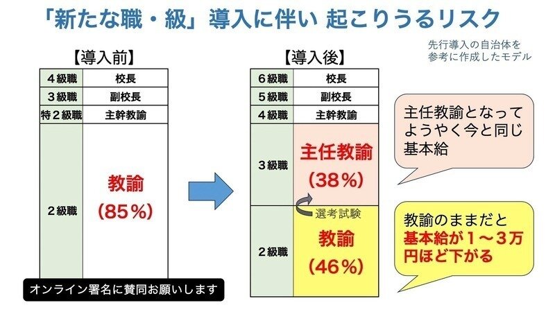署名では、基本給が下げられるリスクを前面に出していますが、この改革案は、教師同士が支え合う同僚性を奪い取り、教育委員会や校長のトップダウンを支える、上の目ばかりを気にする職員室を作り出すという、より大きな問題もはらんでいます。