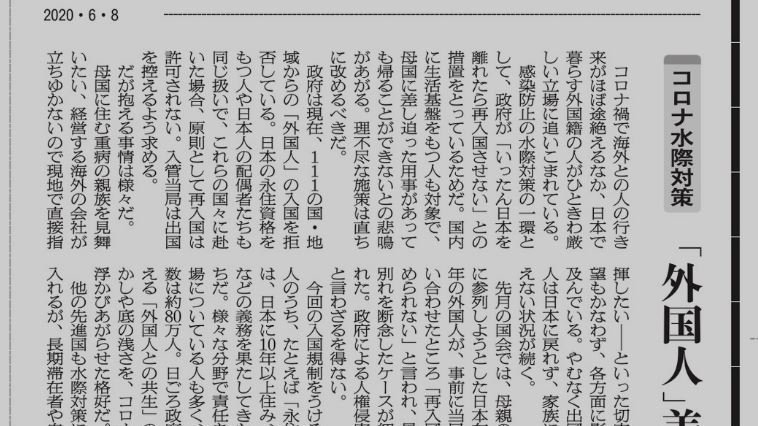 6/8の朝刊の社説で朝日新聞が政府の「水際作戦」にあるこの問題を取り上げました。「国内に生活基盤をもつ人も対象で、母国に差し迫った用事があっても変えることができないとのとの悲鳴があがる。理不尽な施策は直ちに改めるべきだ」