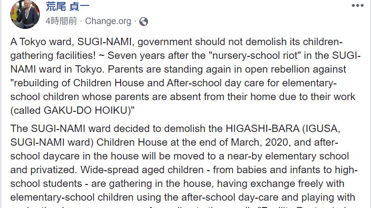 Petition update地域から子どもの集いの場をなくさないで!~杉並区1地区1館全41館あった学童併設の児童館が全廃の危機で、、本当に困っています。。~なんと・・英訳版でシェア頂きました!感謝です!