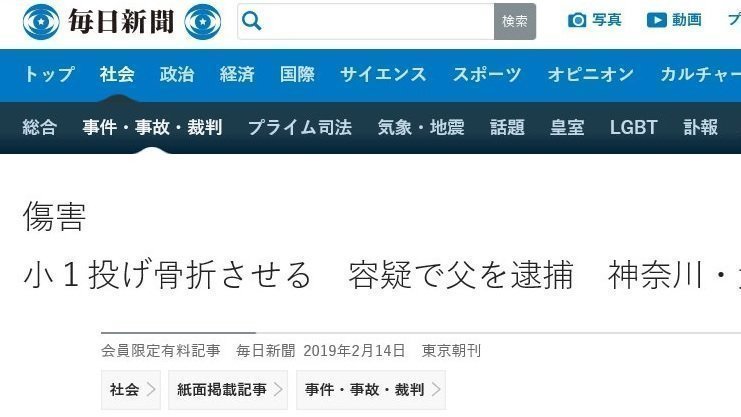 2019年2月14日毎日新聞は,母親の交際相手(事件当時養父)による男児への暴行事件を「小1投げ骨折させる 容疑で父を逮捕 神奈川・大和」と報道しました。