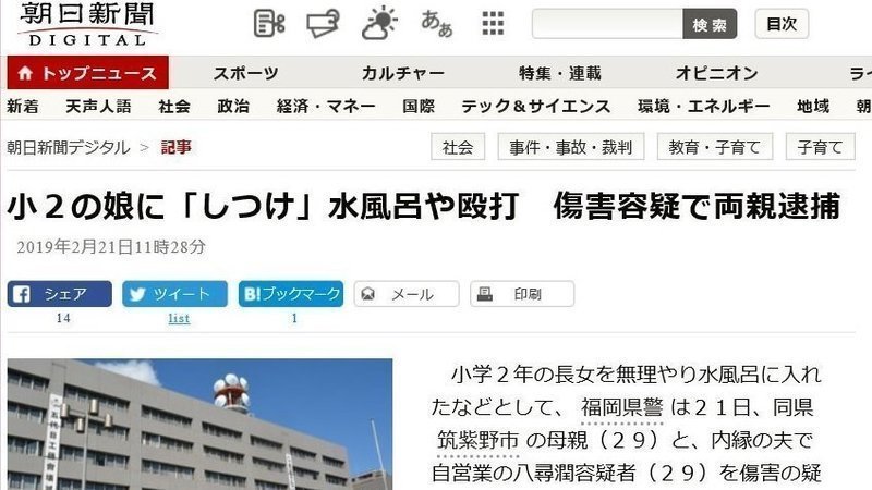 本日の朝日新聞社の報道では,母親とその内縁の夫が,小2女児を縛って水風呂に入れ殴るなどして擦過傷や打撲痕の残る傷害事件を「両親逮捕」として報道しました。