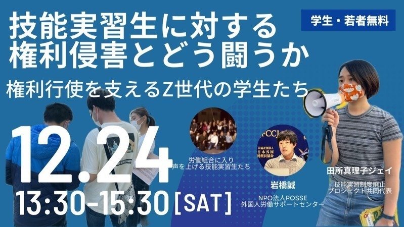 さて、プロジェクトではタイトルにもある通り、12月24日(土曜)13:30から「技能実習生に対する権利侵害とどう闘うか〜権利行使を支えるZ世代の学生たち〜」というイベントを開催することになりました。