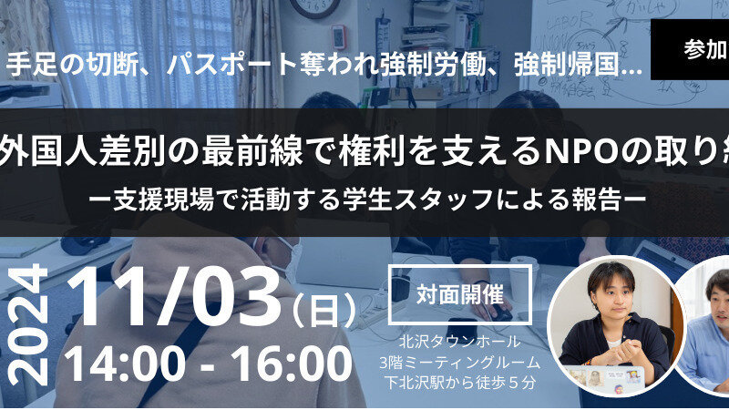 本イベントでは、外国人労働問題の最前線から見えてくる実態と、権利行使を支えるNPOの取り組みについて紹介していく。具体的な事例と取り組みを見ていきながら、外国人労働者の権利を実現するために何ができるのか、私たちと一緒に考えていこう。