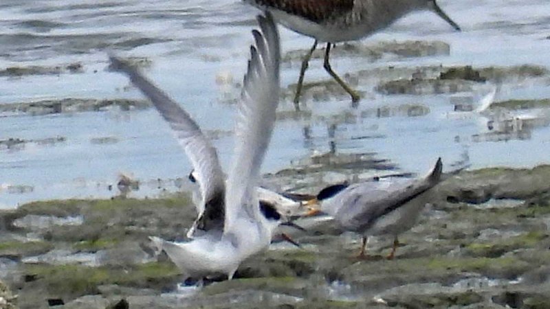 今年の夢洲でのヒナの巣立ちは絶望視されていましたが、なんと、7月17日午後、カモやシギ・チドリが憩う湿地の中州で、コアジサシ数羽が見られたので、超望遠レンズで撮影したところ、なんとヒナに給餌する姿が確認できました!! 19日再び訪れ、探しましたが、その場所にはいません。ヒナはかなり大きくなっていたので、十分移動できるようになっていたと思われます。また、この日は、ハヤブサをコアジサシがモビングして追っていく姿も目撃されています。