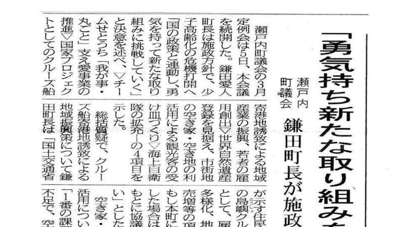瀬戸内町町議会の3月定例会は5日、本会議を続開した。鎌田愛人町長は施政方針で、少子高齢化の危機打開へ「国の政策と連動し、勇気をもって新たな取り組みに挑戦していく」と決意を述べ、▽チームせとうち「我が事・丸ごと」支え愛事業の推進▽国家プロジェクトとしてのクルーズ船寄港地誘致による地域産業の振興、若者の雇用創出▽世界自然遺産登録を見据え、市街地の空き家・空き地の利活用による観光客の受け皿作り▽海上自衛隊の拡充―の4項目を示した。