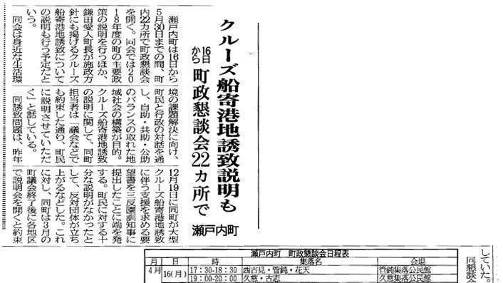 同誘致問題は、昨年12月19日に同町が大型クルーズ船寄港地誘致に伴う支援を求める要望書を三反園訓知事に提出したことに端を発する。町民に対する十分な説明がなかったとして、反対団体が立ち上がるなどした。これに対し、同町は3月の町議会終了後に各地区で説明会を開くと約束していた。