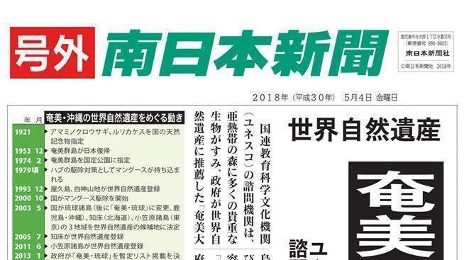 本日の南日本新聞の号外で、国際教育科学文化機関(ユネスコ)が政府が世界自然遺産に推薦した「奄美大島・徳之島・沖縄島北部および西表島」について、推薦内容の抜本見直しを求める「登録延期」を勧告したという内容の記事が掲載されました。