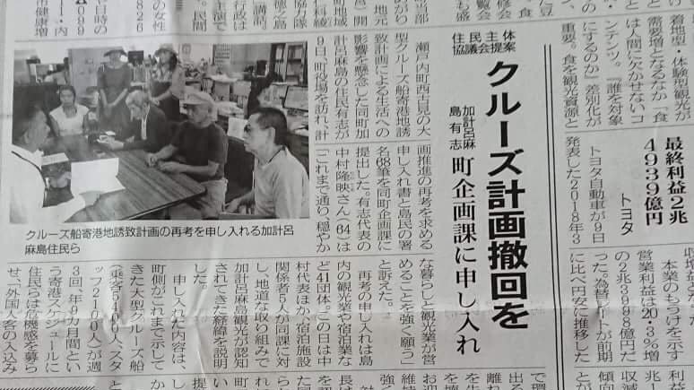 ▽2018年5月10日南海日日新聞:加計呂麻島の有志が、大型クルーズ船誘致撤回を求める要望書を提出したという記事です。▽