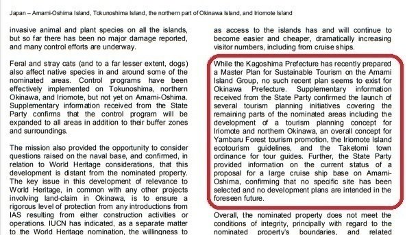 「鹿児島県は最近、奄美群島で持続可能な観光のためのマスタープランを作成したが、そのような最近の計画は沖縄県にとっては存在しないようだ。 締約国(日本国)からの補足的な情報は、指定された地域の残りの部分をカバーするいくつかの観光計画イニシアチブの立ち上げを確認した。ここでは、西表島と北部沖縄の観光計画コンセプトの開発、やんばるの森観光プロモーションの総合コンセプト、西表島エコツーリズム ガイドライン、ツアーガイドの為の竹富町条例 。また、締約国(日本国)が奄美大島の大型クルーズ船を対象とした提案の現状についての情報を提供し、具体的な敷地は選択されておらず、将来の開発計画もないことを言明した。」