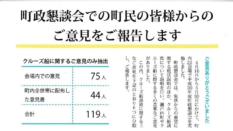 瀬戸内町が発行する、広報せとうち10月号に別紙で添付されていました、4月16日から5月30日にかけて瀬戸内町の各集落で行われた町民の意見をまとめたA4サイズ裏表1枚の用紙の書き起こしです。