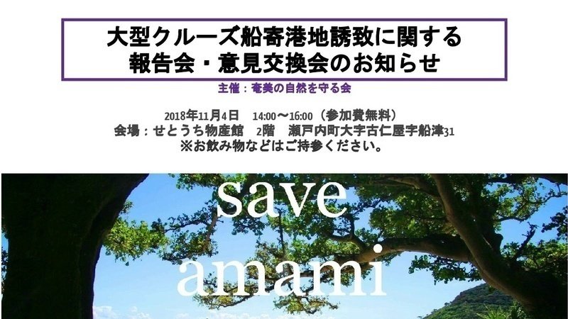 明日、11/4(日)に奄美の自然を守る会主催で行われる「大型クルーズ船寄港地誘致に関する報告会・意見交換会」で配布予定の資料、及び、FaceBookライブ、YouTubeライブでの生中継のお知らせです。