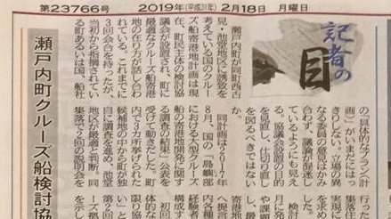 検討協議会は18年10月に発足。町への効果や課題等を調査分析し、最適なクルーズ船寄港地の在り方を町長へ提言する目的で、町内各種団体代表に学識経験者を交え、19人で構成する。