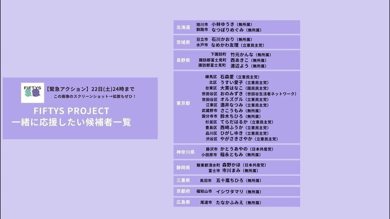 以下候補者リストを掲載しますので、ぜひ周りへのシェア・連絡をお願いします。