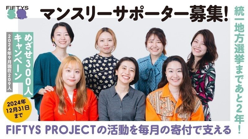 FIFTYS PROJECTでは、この度、次の2027年統一地方選挙に向けて100名の候補者を支援することを目標に設定しました!残り2年半、その体制を整えるためにフルタイムスタッフを1名増員したいと考えています。この増員は、月3,000円のご支援をくださる方が100人増えることで実現が可能です。