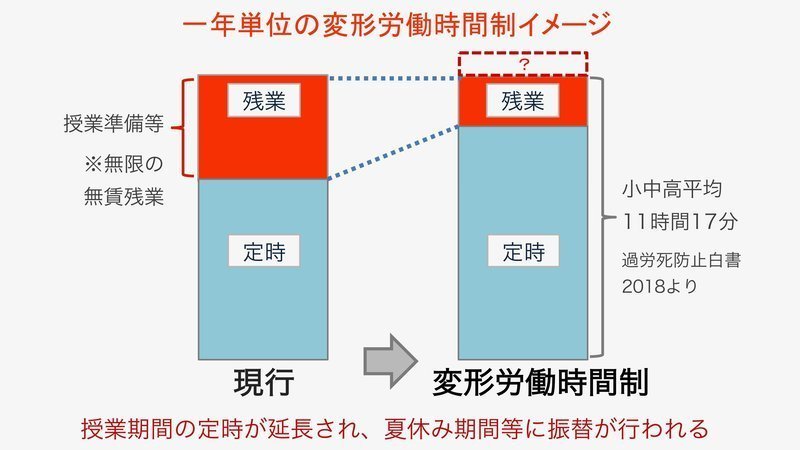 これは、画像の通り、授業期間の定時を伸ばして夏休み期間の「閑散期(夏も暇ではないのですが…)」に振替えるというものです。