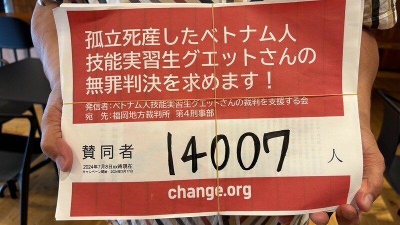 公判が始まる前の11時半には、支援団体として7月7日までに集まったグエットさんの無罪を求める署名、オンライン署名と紙署名の合計14,007筆を福岡地裁に提出いたしました。ご協力いただいた皆様、ありがとうございました。