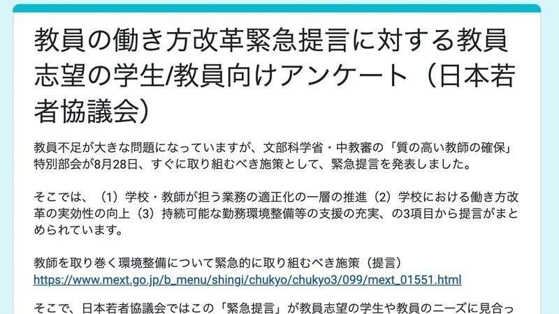 先日発表された文部科学省・中教審の教員の働き方改革「緊急提言」に対して、当事者の意見を可視化するために、教員志望の学生・教員向けにアンケートを実施することになりました。