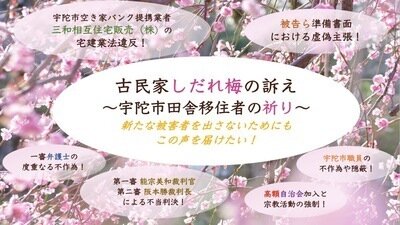 購入した古民家の庭にある「しだれ梅」は3月初旬になると綺麗に花を咲かせます。私たちが苦しい状況でありつつも、私たち夫婦を癒す存在でもありました。その「しだれ梅」から感じた思いを胸に、この問題に立ち向かっていきたいとの思いから発信者の名前を「古民家しだれ梅の訴え」とし、祈りを込めて「〜宇陀市田舎移住者の祈り〜」を付け加え、署名活動を行う決意をし、準備を進めて参りました。