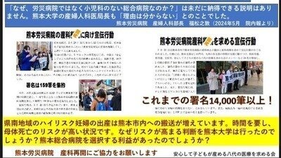 「医療の主人公は患者」です。熊本大学病院は「子どもを産み、育てたい」という願いにこたえるべきです。そのためには、中核病院としての役割を果たしてきた実績があり、現在も産婦人科医師の派遣で周産期医療が実施できる体制がある熊本労災病院に派遣することです。