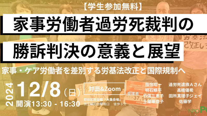 12/8(日)13時半から都内にて、今年9月に勝ち取った家事労働者過労死裁判の逆転勝訴判決と、労働基準法改正や国際条約の批准など今後の展望を検討するイベントを開催します。