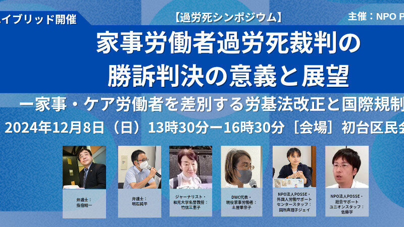 12/8(日)13時半から都内にて、今年9月に勝ち取った家事労働者過労死裁判の逆転勝訴判決と、労働基準法改正や国際条約の批准など今後の展望を検討するイベントを開催します(オンライン参加も可能です)。