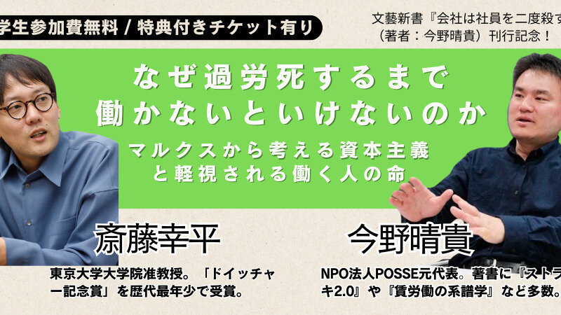 そして、マルクスの時代から100年以上経過し、AIやICT化など高度なテクノロジーが発展して人間の労働が「不要」になるとすら言われるようになった今日において、状況は変わっていないどころかむしろ悪化しているとさえ言えます。そこで、本イベントでは、『人新世の資本論』や『ゼロからの『資本論』』の著者である斎藤幸平東京大学准教授をお招きし、今年6月に『会社は社員を二度殺す 過労死問題の闇に迫る』を刊行した今野晴貴・NPO法人POSSE元代表とともに、マルクスの理論を手がかりにして、現代の働き方を考えていきます。