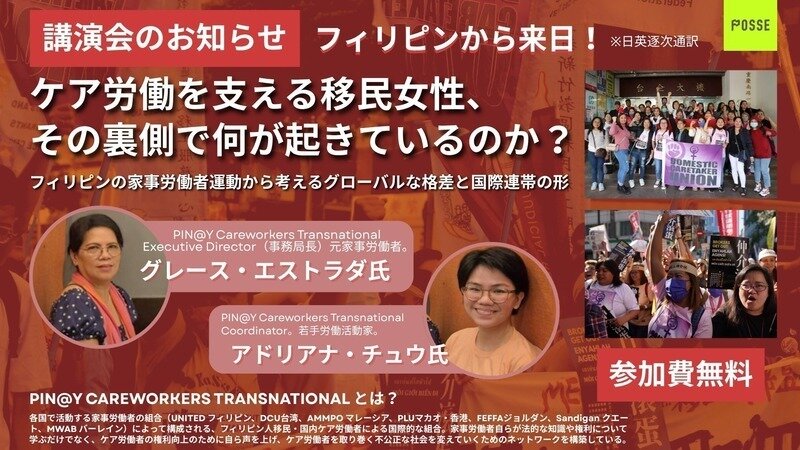 この度、中東やアジアの過酷なケア現場で働く家事労働者を支援するフィリピンの活動家2名を招いて、下記のイベントを開催する運びとなりましたので、お知らせいたします!