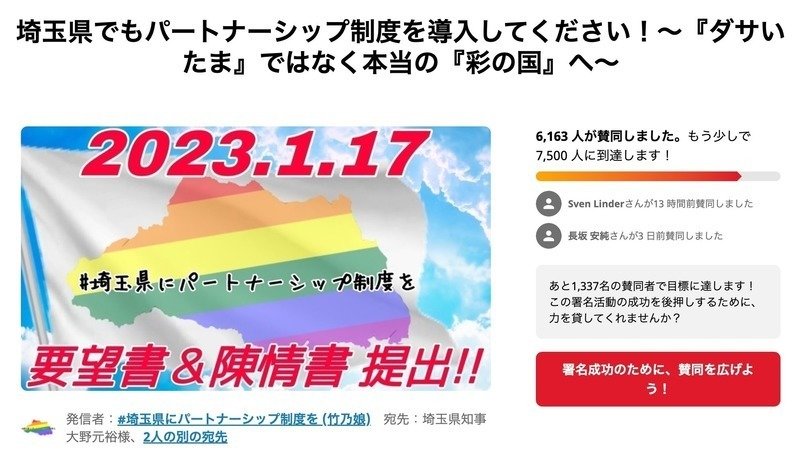 An online petition to Saitama Prefecture, a neighboring prefecture of Tokyo, to introduce a Partnership/Familyship system. The signatures will be submitted with a petition to Saitama Prefecture on January 17, 2023.