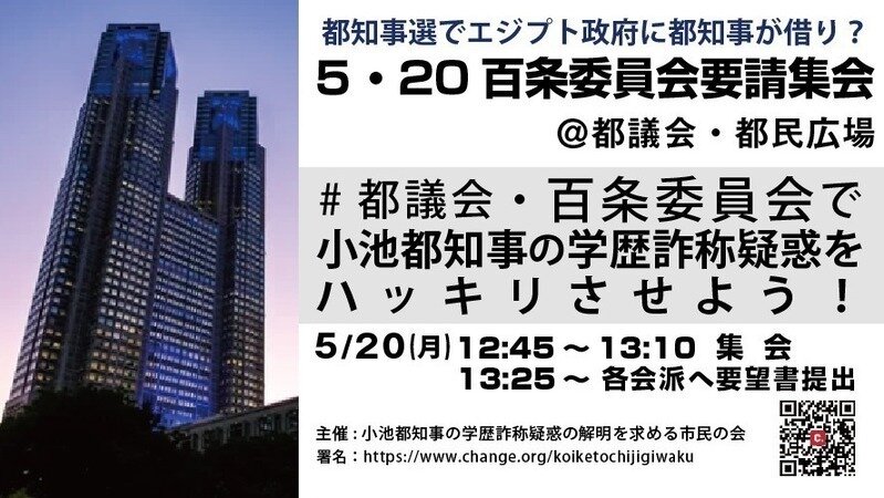 Petition update#小池百合子都知事に対し、学歴詐称疑惑について国民が納得できる詳細な説明を求めます。都議会・百条委員会を設置し、都知事の学歴詐称疑惑の解明に向けて徹底調査するよう要望書を5月20日に議長と各会派へ提出、集会も開催します!ご参加を!