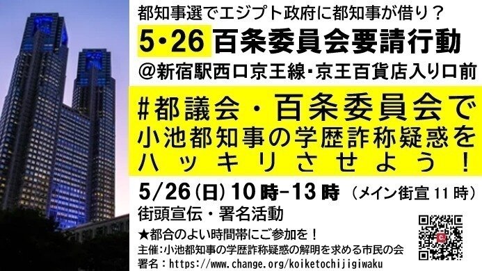 5月26日(日)、都知事学歴詐称疑惑・百条委員会要請アクションは、11時からをメイン街宣としました。