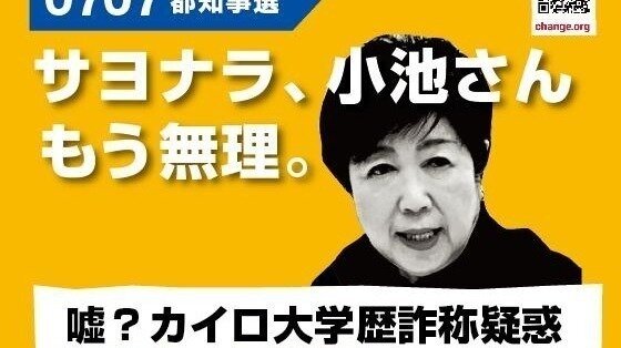 Обновление к петиции#小池百合子都知事に対し、学歴詐称疑惑について国民が納得できる詳細な説明を求めます。「サヨナラ、小池都知事」アクション行います! 6/8(土) 16時~有楽町駅前、 6/9(日)16時10分~ 新宿駅東南口