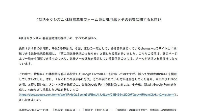 その中で、皆様からの体験談を募る為設置したGoogle FormのURLを記載したのですが、誤って管理者用のURLを掲載してしまいました。昨日、1月6日の午後2時41分頃、その事実に気づいた方が連絡をしてくださり、同日午後11時56分頃、お寄せ頂いたコメント内容を保存の上、当該Google Formを削除致しました。その後、新たにGoogle Formを作成し、noteなどに掲載したURLを新しいもの(https://docs.google.com/forms/d/e/1FAIpQLScmiq5gPBctU1JJ6LavV04E466w2I209FQevvl6R9gmQkHw-Q/viewform)に差し替えました。