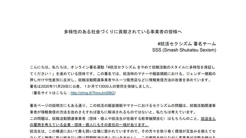 就活セクシズム に加担しないこと、具体的には、就活生のジェンダー・アイデンティティを尊重すること、性差別的な規範を押し付けない選考を行うこと、就活生のジェンダー表現によって選考上差別をしないこと等を声明で発表して頂きたい、という要請です。