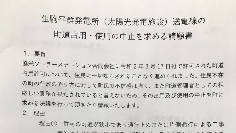 「メガソーラー送電線の町道使用の中止を求める署名」について