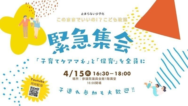私たちはこの現状を「日本の緊急事態」ととらえ、妊娠・出産・育児の不安をなくし“子育てが楽しい国”を実現するため、当事者や支援者、専門家らとともに課題を明確にし、各党の政策担当者とともに議論する緊急集会を開催します。