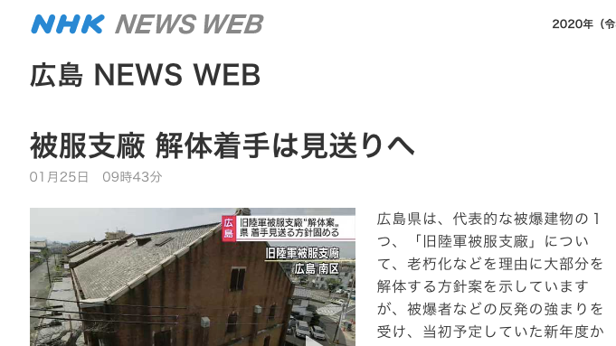昨日の朝、NHK NEWS WEBにて「被爆建物「旧陸軍被服支廠」の解体 新年度着手見送りへ」と報道されました。